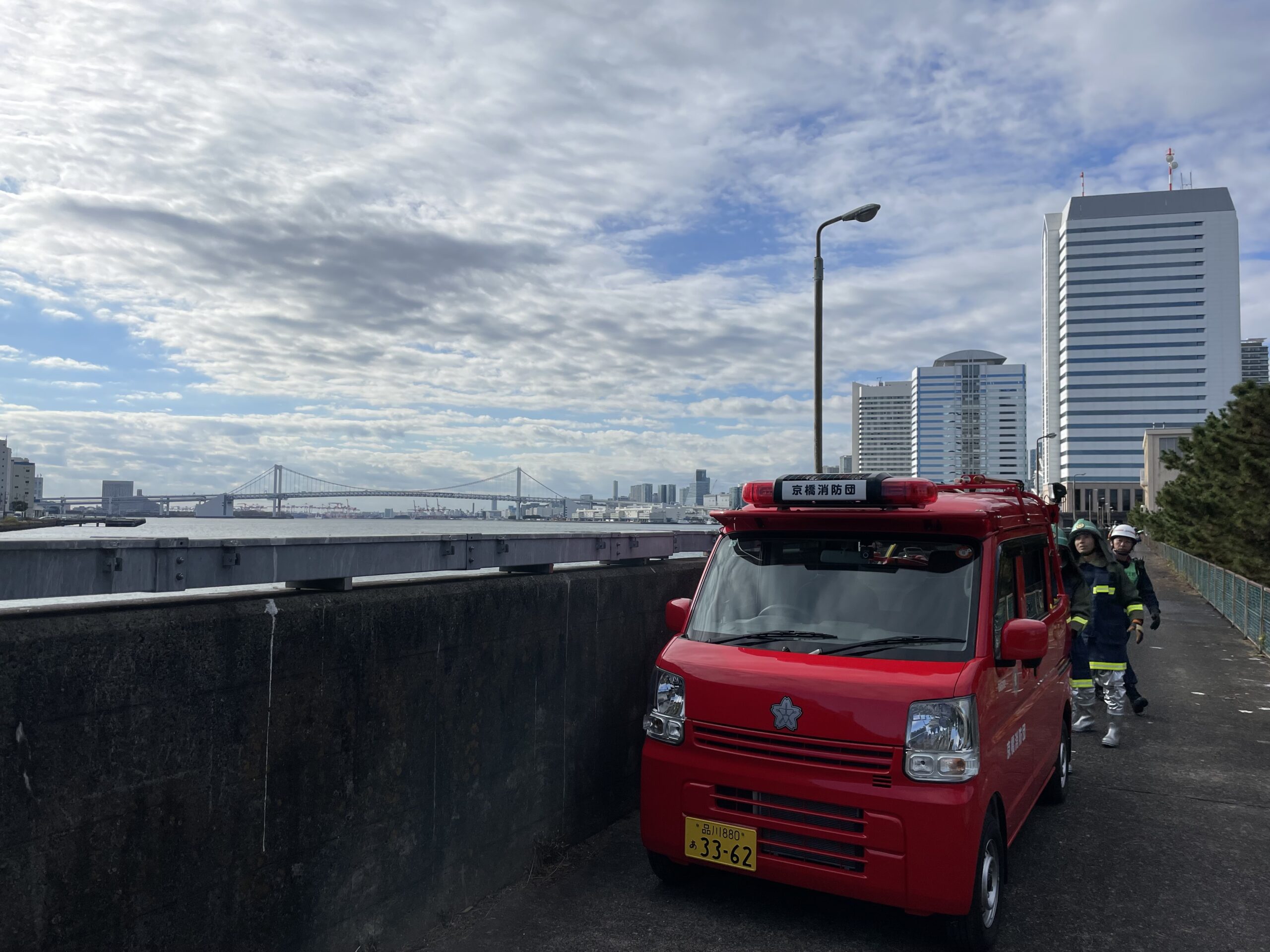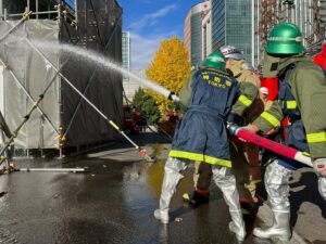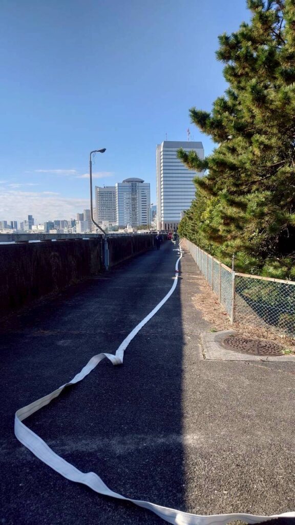 2025年11月29日 / 最終更新日時 : 2025年11月29日 kyobashi_toko 第七分団 震災訓練に参加しました! 第七分団ブログ担当です。11月29日、東京消防庁震災訓練が行われ、京橋消防団第五分団、第六分団、第七分団は浜離宮排水機場にて長距離ホース延長訓練を行いました。各分団7本、計21本、約400mのホース延長を行い、私たち第七分団は先頭での放水にも参加しました!東京タワーやレインボーブリッジの見えるTHE東京なロケーションです!🗼晴天の中、分団間を超えて多くの団員とコミュニケーションを取りながら実施し、署員の方々からはたくさんのアドバイスも頂戴し、とても良い訓練となりました! FacebookX