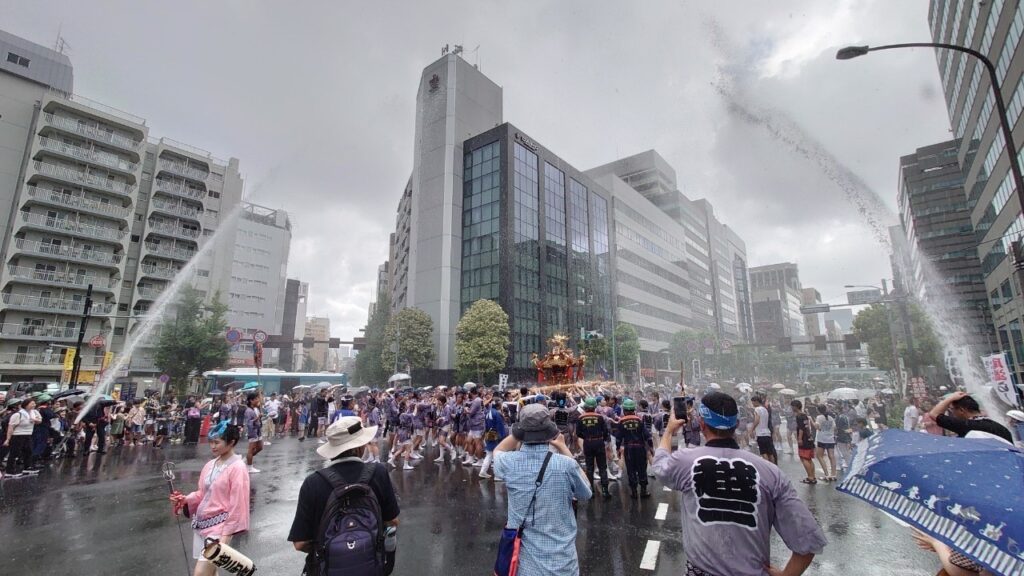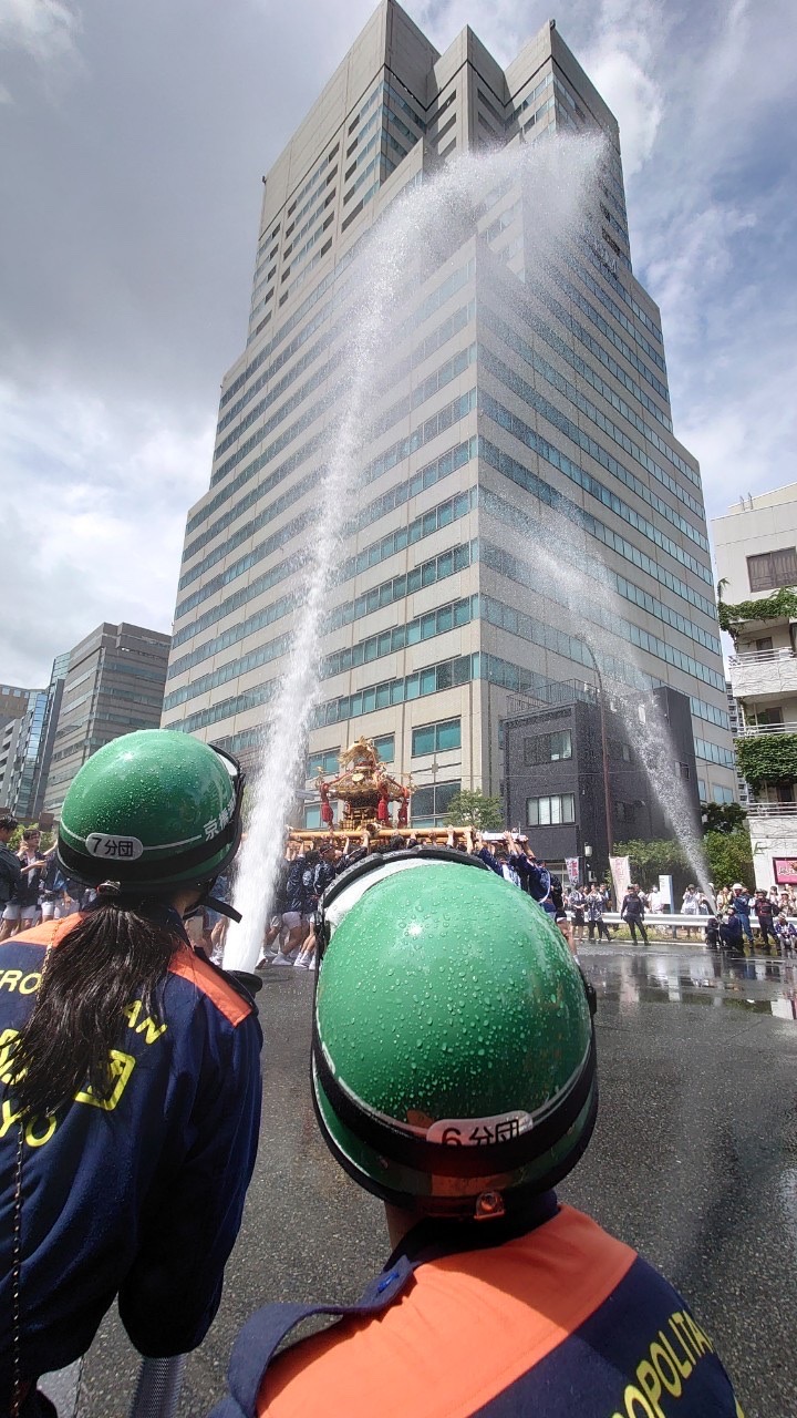 水かけ祭りとしても有名で、私たち消防団員は永代橋西詰において53基の神輿に消防ホースによる奉納放水を実施します!(8月16日)