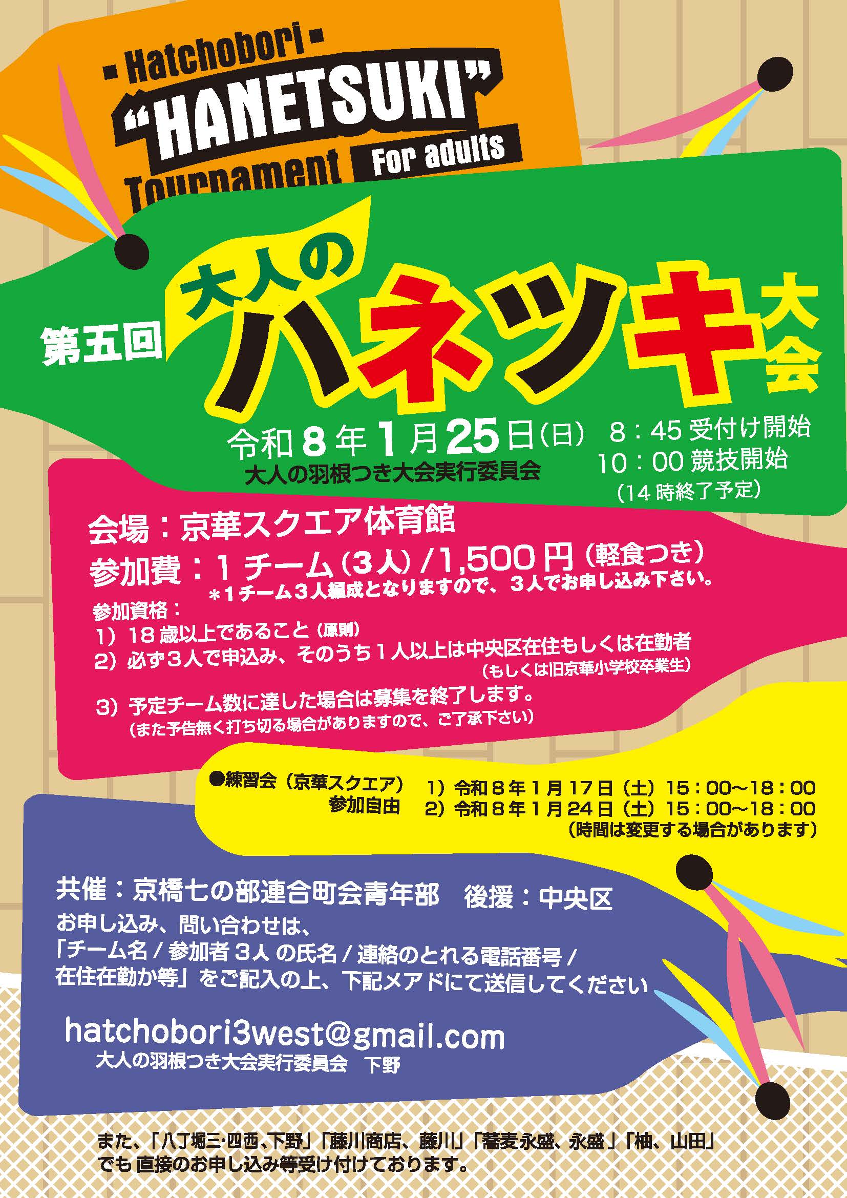 ・3人1チームで申し込み、そのうち1人以上は中央区在住もしくは在勤者(もしくは旧京華小学校卒業生)