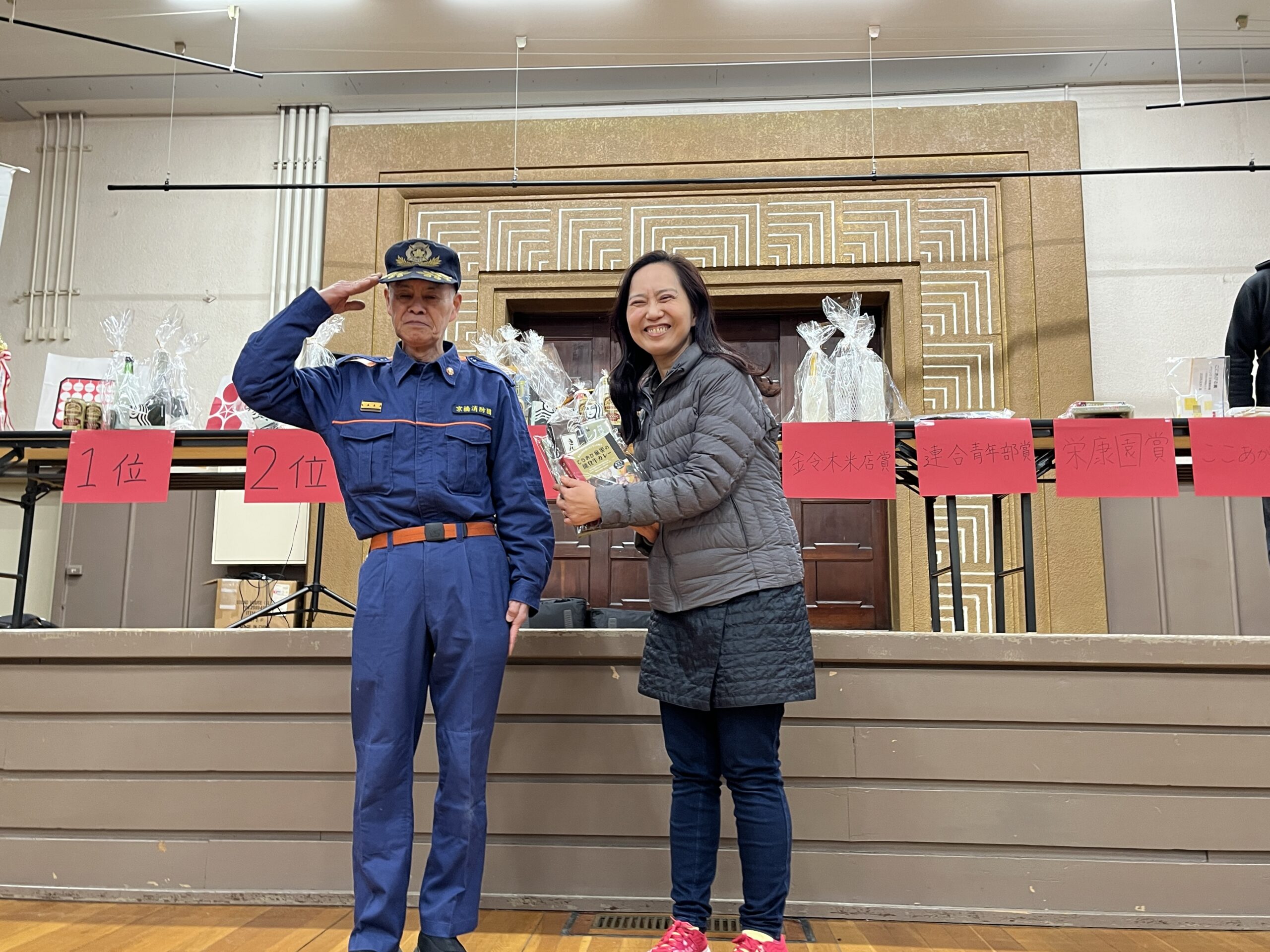 われらが沢村分団長が第一分団賞を差し上げるもいつも分団長は目をつむっている!