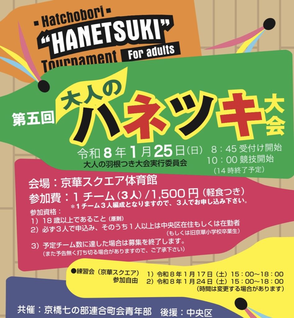 なお、今回開催された「大人のハネツキ大会」は、「中央区の伝統として子供の頃から慣れ親しんできた羽根つきを大人のわれわれも忘れてはならない!」と、八丁堀町会メンバーが一念発起をして発案。区にもはたらきかけ協力をいただく形で2022年に第1回の開催が実現し、今年で第5回目の開催となりました。