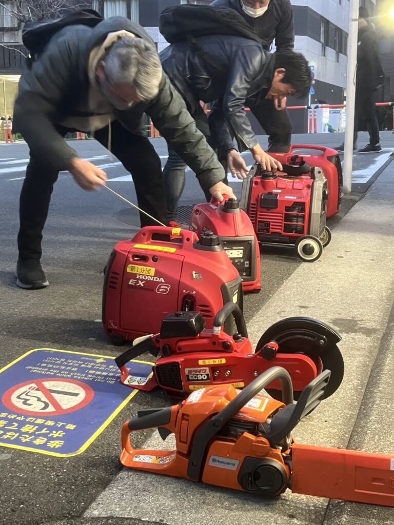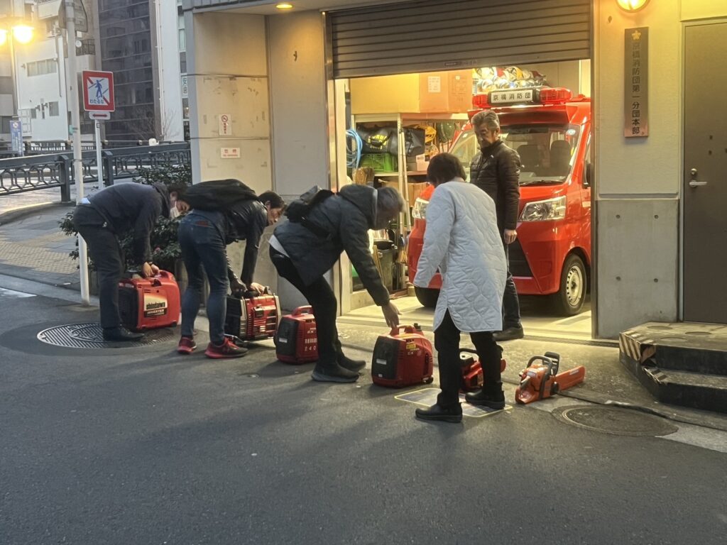 まず最初に行うのは分団庫前および内部の清掃と、分団庫に設置されている発電機や可搬消防ポンプ、チェーンソー、エンジンカッターの動作確認です。