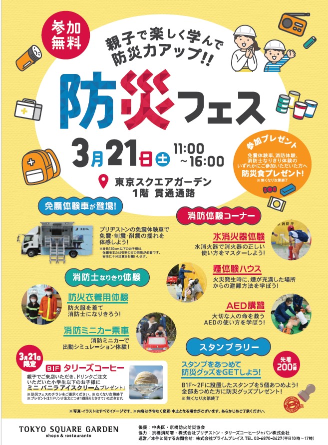 2026年3月6日 / 最終更新日時 : 2026年3月6日 kyobashi_toko 第二分団 防災フェス開催(3/21東京スクエアガーデン) 銀座線京橋駅直結の東京スクエアガーデンにて3月21日(土曜日)に防災フェスが開催されます。 ビルのテナントからのサービスや、スタンプラリーも行いますので、銀座や日本橋へのお買い物ついでに是非お立ち寄りください。 (実施状況については開催後改めて投稿します) 開催日 3月21日(土曜日) 時間 11:00~16:00 内容 ・体験コーナー 水消火器 煙体験ハウス AED講習 ・消防士なりきり体験 防火衣着用体験 消防電動カー ・消防団加入案内 FacebookX