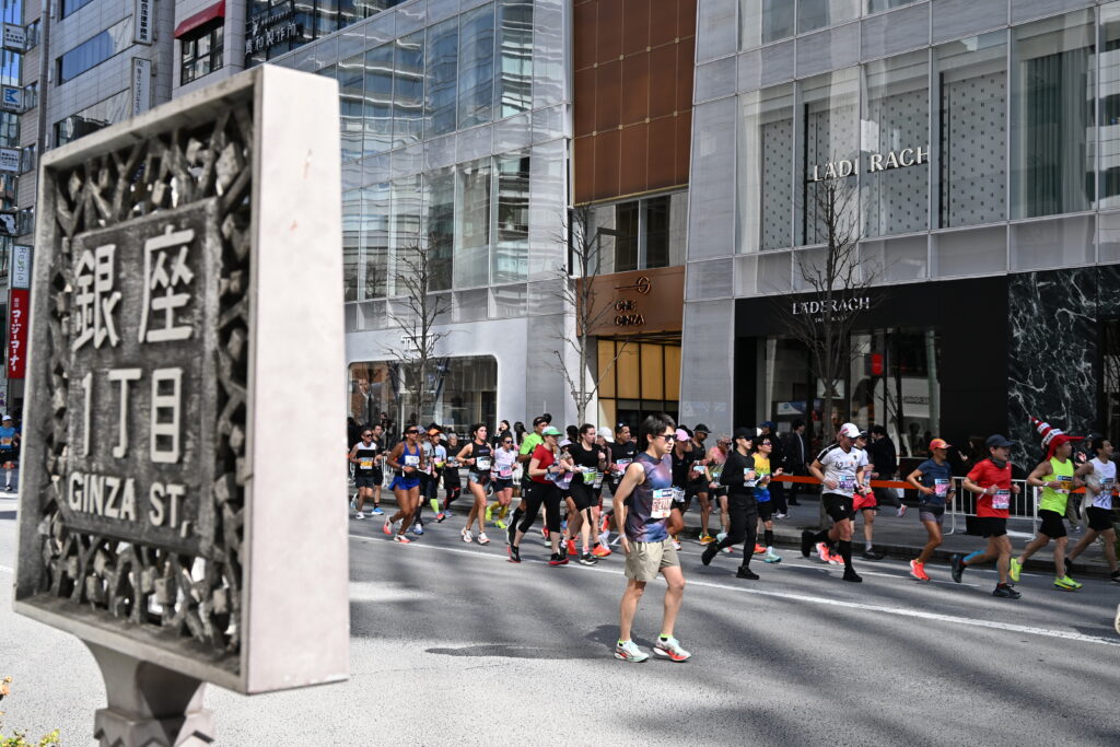 東京マラソンを象徴する地点のひとつである33キロ地点(銀座4丁目付近)は団本部、第4分団、第6分団で警戒にあたりました。晴天に恵まれたため、同地点周辺はランナーを応援する多くの人たちで混雑しました。参加ランナーは定員で約3万9000人(うちマラソン3万8500人)とあって、都心の名所をめぐるコースではランナーがとぎれることはありません。数時間にわたりコースを横切ることはできないため、警戒活動をしながら、道案内を務める場面も多くありました。