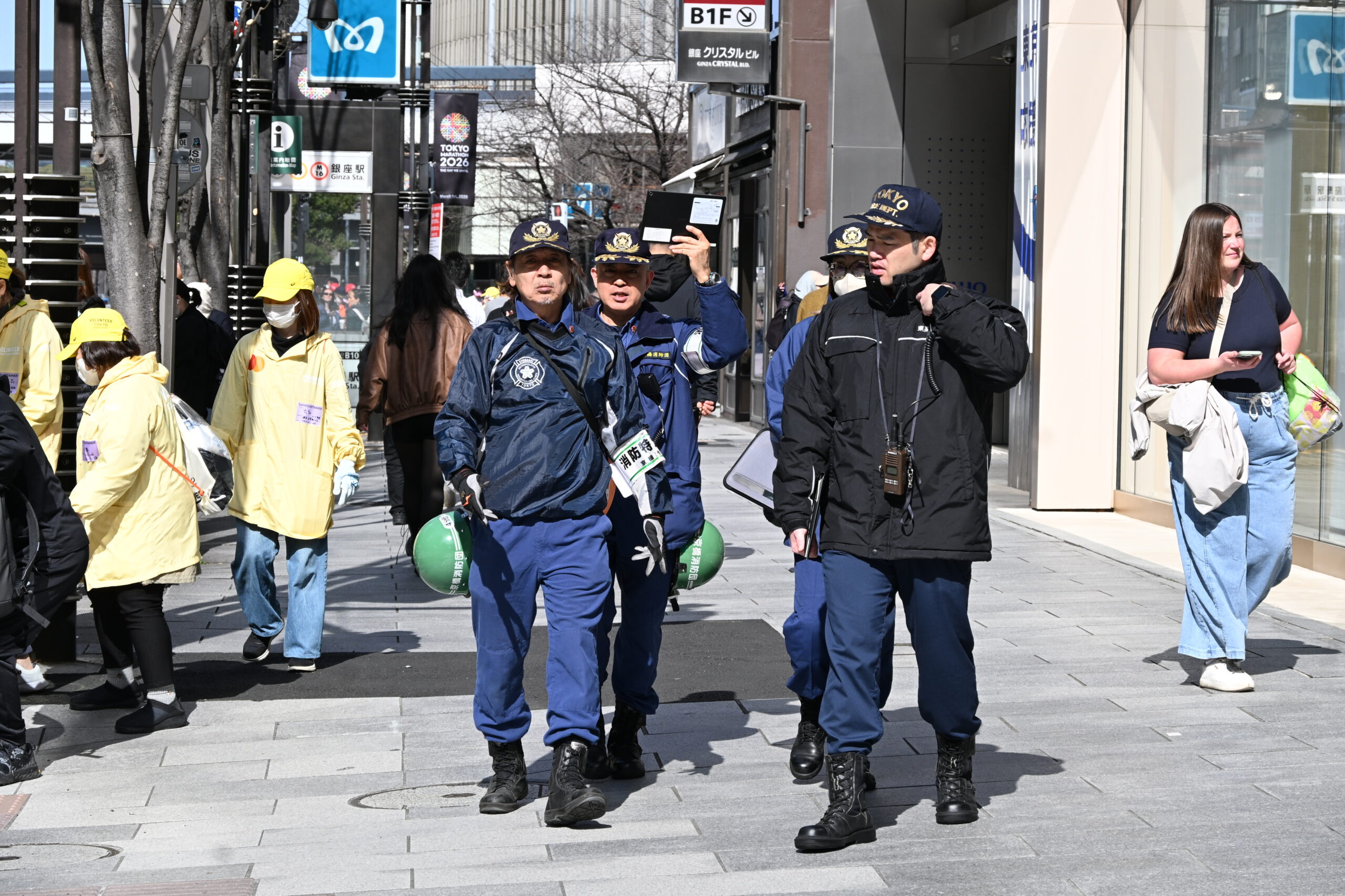 東京マラソンを象徴する地点のひとつである33キロ地点(銀座4丁目付近)は団本部、第4分団、第6分団で警戒にあたりました。晴天に恵まれたため、同地点周辺はランナーを応援する多くの人たちで混雑しました。参加ランナーは定員で約3万9000人(うちマラソン3万8500人)とあって、都心の名所をめぐるコースではランナーがとぎれることはありません。数時間にわたりコースを横切ることはできないため、警戒活動をしながら、道案内を務める場面も多くありました。