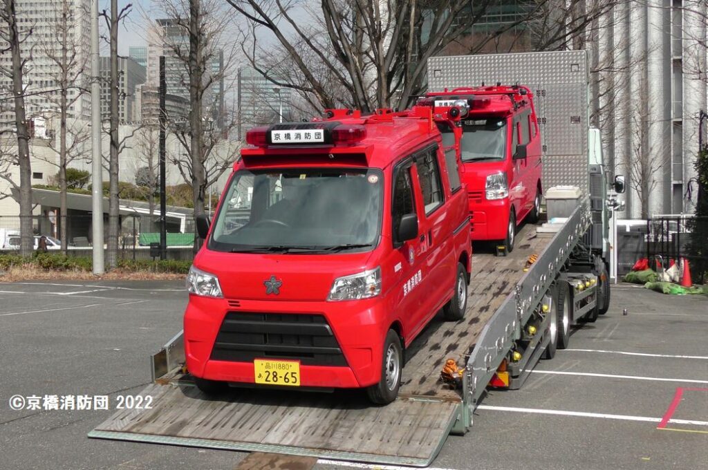 京橋消防団では、7台の可搬ポンプ積載車を運用し、